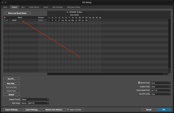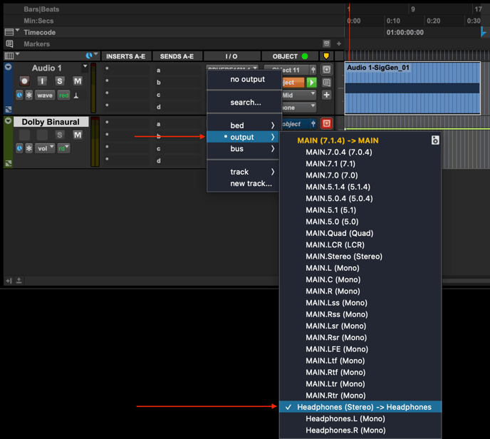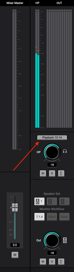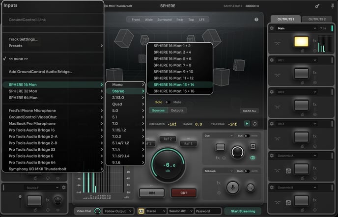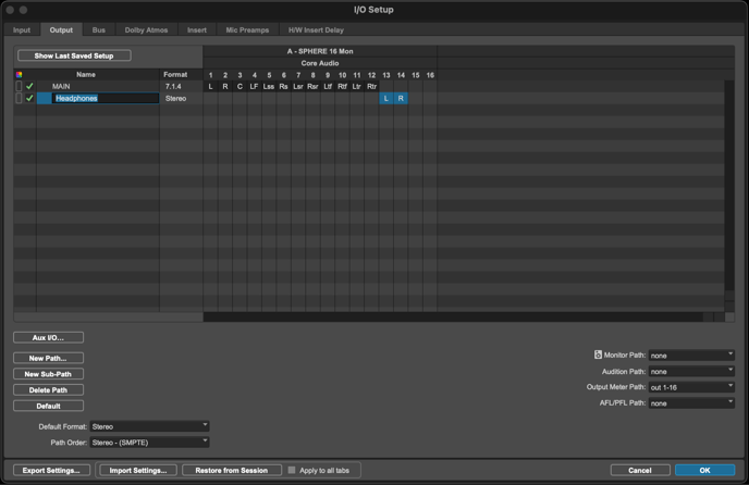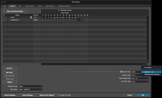 Select SPHERE 16 Mon> Stereo> SPHERE 16 Mon 13 + 14. This is the output from the Dolby Binaural Aux Track from earlier.
