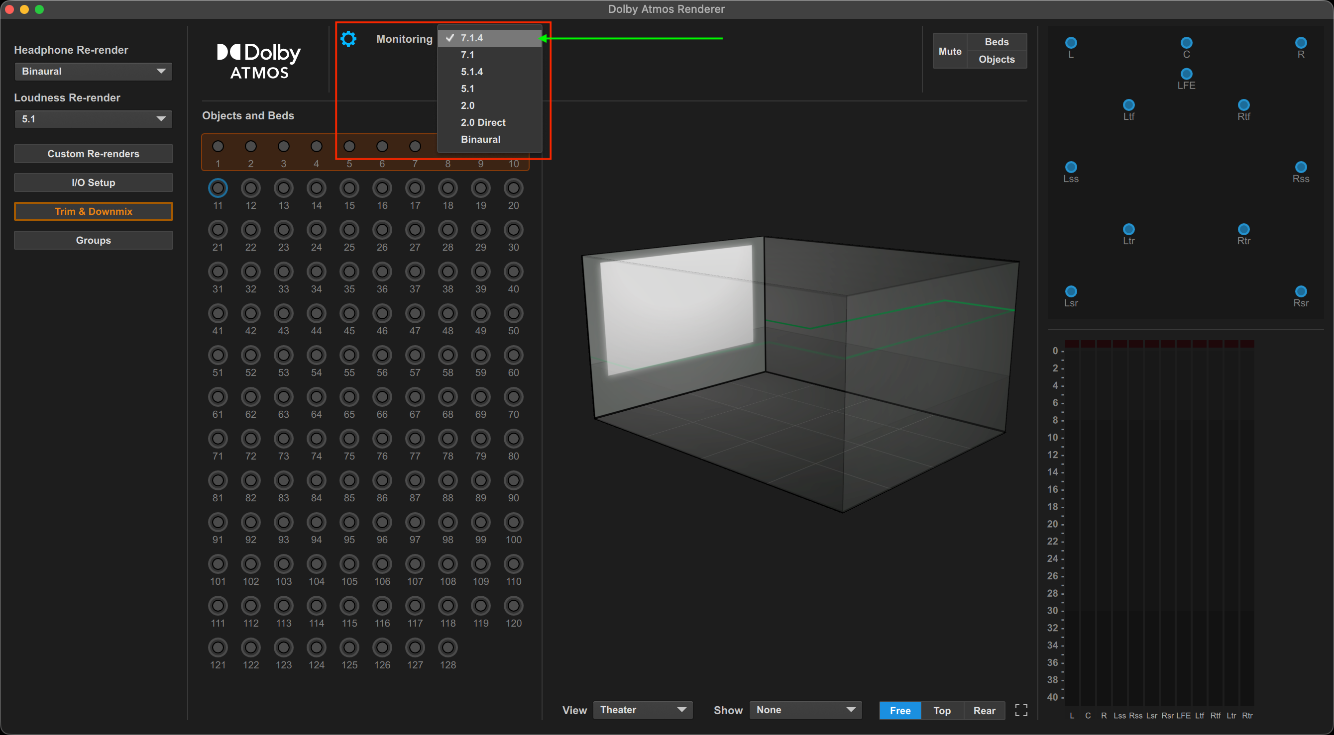 Next, make sure that Pro Tools' Dolby Atmos Renderer Monitoring is set to 7.1.4.