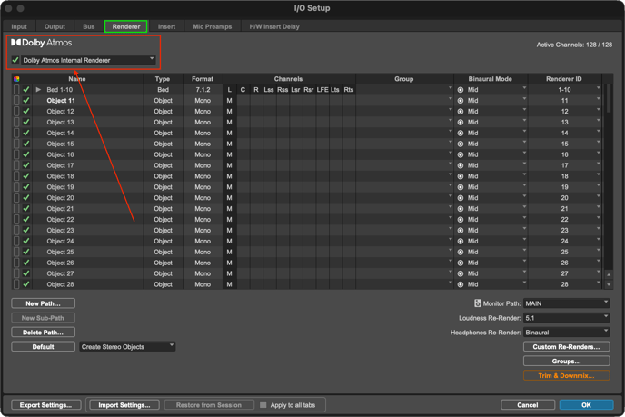 Finally, before closing the I/O window, make sure that the Dolby Atmos Internal Renderer is enabled. Select the Renderer tab and from the dropdown select Dolby Atmos Internal Renderer, put a check in the check box and click OK to close the window.