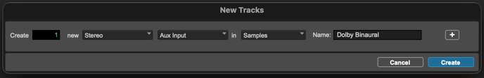 First we need to create an Aux Input track to properly route the Dolby binaural renderer. Command ⌘ + Shift ⇧ + N opens the new track dialog box. Choose Stereo, Aux Input and name it Dolby Binaural.