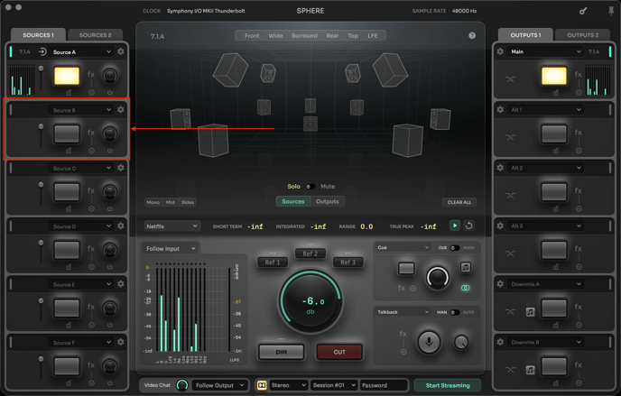 To hear the Apple Spatial Renderer select Source A & Downmix A.