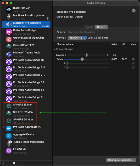 First install Sphere. Sphere includes 3 multichannel Core Audio busses one of which we’ll use to connect Pro Tools to Sphere and then Sphere to the Symphony I/O MkII. You can see them here in AudioMIDI setup.
