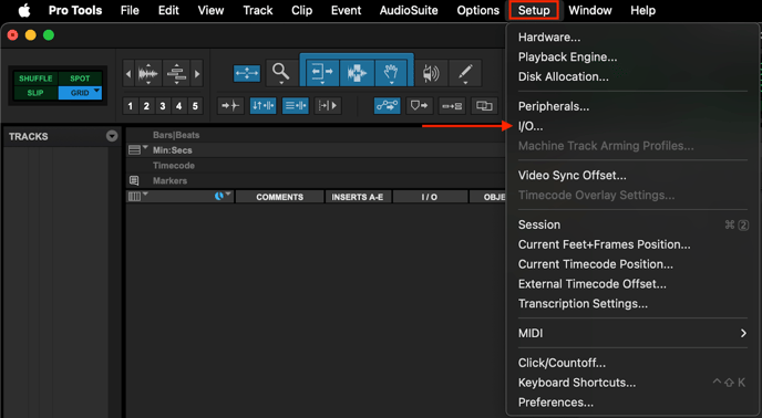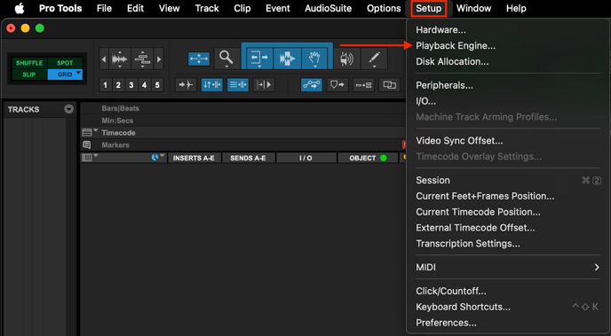 To keep things simple, we will build a new, very small Atmos Pro Tools session from scratch. In Pro tools, go to Setup> Playback Engine.