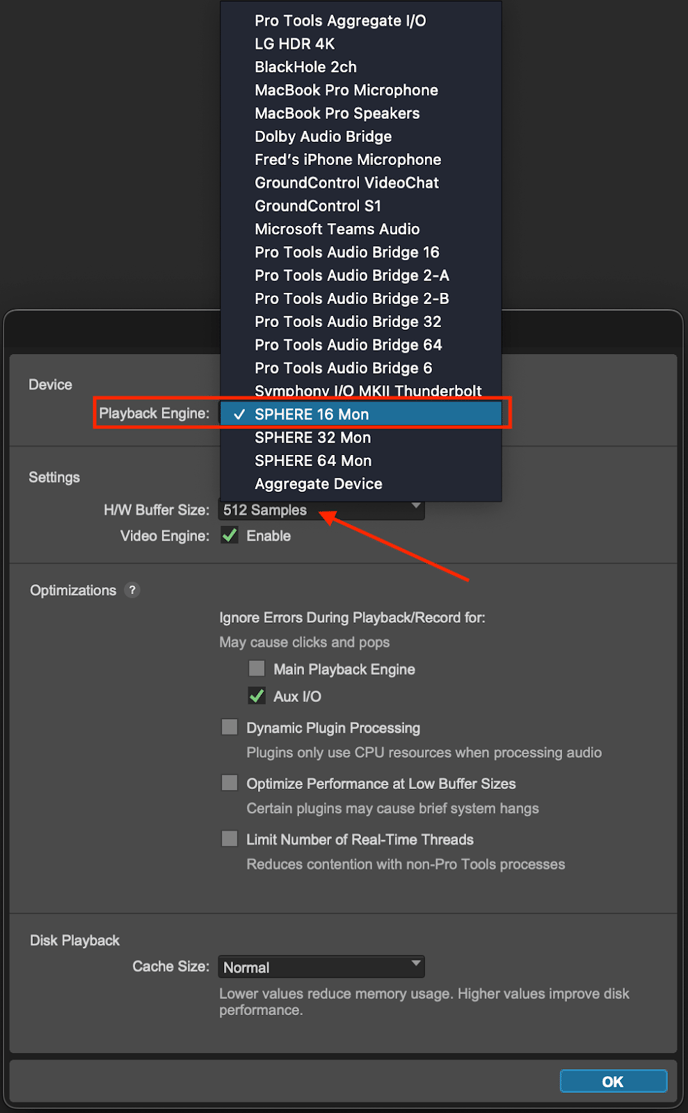 From the Playback Engine dropdown menu, select SPHERE 16 Mon.