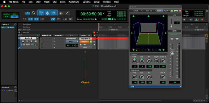 In the Edit window create a mono track and make it an Object track by clicking on the "Bus" button.