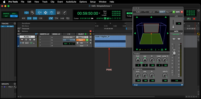 Here we see a simple Pro Tools Atmos session playing some test audio.