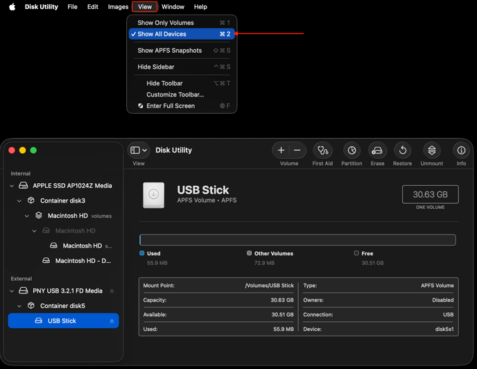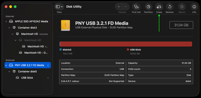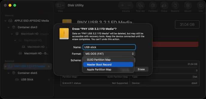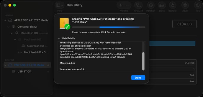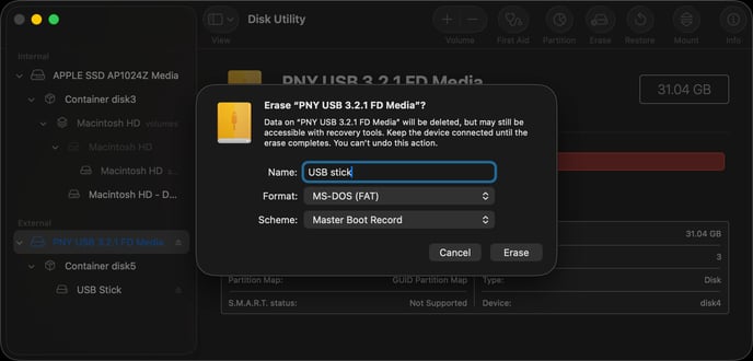 Insert the USB stick into your Mac - you may need to use an adapter that goes from USB A to USB C if your Mac was made after ~2020.
