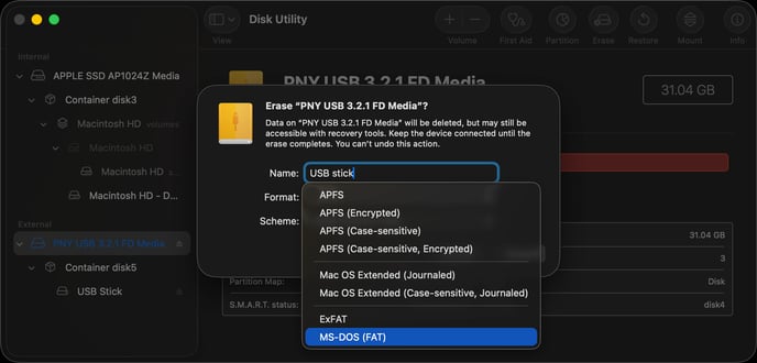 Give it a name and from the Format dropdown, select MS-DOS (FAT).